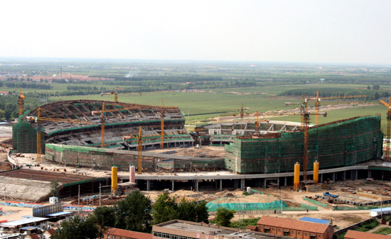 9月6日,濰坊奧體中心體育場工程主體順利封頂。這個具有現代化功能的大型建筑工程以雄偉的恣態呈現在人們的面前。 濰坊奧體中心體育場工程,是為2009年的第十一屆全運會召開而興建的主要體育場館之一,也被確定為第一預備主會場,設計45000座,整體架構如新建的沈陽五里河體育場,無論投資規模還是建筑面積都是濰坊的重點建設項目,因此建設這項體育工程對濰坊來說意義非凡。省市各級領導、部門負責人高度關注工程建設情況,副省長黃勝,省建設廳廳長、黨組書記楊煥彩、常務副廳長萬利國,省體育局局長張洪濤,濰坊市委書記、人大常委會主任張新起、市長許立全、副市長劉偉、王桂英等多次親臨現場督導工作。 為完成好這項建設任務,市建設局專門抽調得力人員組建現場指揮部,統籌和協調整個工程的建設。集團公司組織了豐富的建設資源,多渠道、多方式加快工程建設速度,組成了高效、精干、專業化項目部,全面組織工程施工。從3月22日西、北、南三個看臺正式破土動工以來,先后有第一、二、六三個土建分公司、第二安裝分公司、機械化施工分公司、物資供應處、勞務管理處等專業單位參與施工,作業人員高峰時達到1500人以上。并在工程建設中創造了國內同類工程建設的多個奇跡,受到業內廣泛好評。與此同時,鋼結構、LED屏等多項后續工程也已陸續展開,各項工作按計劃有序進行。 (08.09.06)