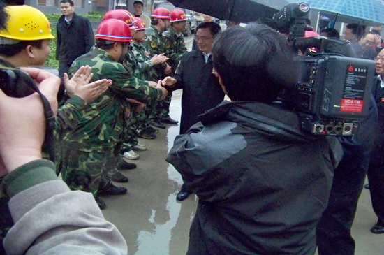 4月13日下午,春雨綿綿,中共中央政治局常委、中央紀律檢查委員會書記賀國強在有關人員陪同下,冒雨視察了北川新縣城援建工作。在集團公司援建的溫泉一期安居房工程現場,賀國強走進住宅樓實地察看已經建好的新居,非常高興,對山東省濰坊市援建的安居房工程給予很高的評價,贊揚山東省濰坊市的援建隊伍是一支能打硬仗的施工隊伍,他感謝在援建工作中作出辛苦努力的所有援建人員,并預祝圓滿完成援建任務。 ![]()