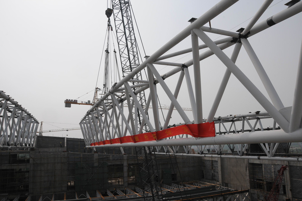 當天下午2點38分,會展中心工程現場鞭炮齊鳴,伴隨著320噸大吊車的一陣轟鳴,最后一榀97噸重的鋼構桁架徐徐升起、吊裝就位、校正扶位。集團公司總經理、會展中心工程總指揮朱九洲,會展中心工程現場總指揮孫孔喜,集團公司副總工程師、會展中心質量技術組組長王維奇及集團公司會展中心指揮部成員、參建單位項目經理參加了吊裝儀式。