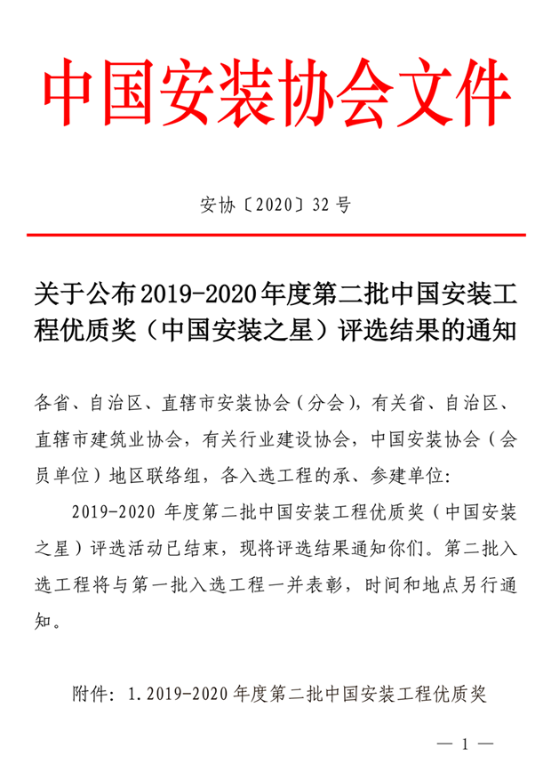 2020年12月10日,中國安裝協會發布通知,通報2019-2020年度第二批中國安裝工程優質獎(中國安裝之星)項目,共222項,集團安裝公司承建的濰坊市第二人民醫院門診病房綜合樓一期(安裝工程)(第144位排序)榮獲該項榮譽。這也是集團建司以來首次參評并獲該項榮譽。據悉,該批次入選項目由272家會員企業擇優推薦,初審243項工程,后經專家審定了238項工程進入今年10月的現場復查,11月,再由大評委無記名投票,產生最終的222項工程入選2019-2020年度第二批中國安裝工程優質獎(中國安裝之星)。中國安裝之星,是經住建部批準設立的安裝行業最高質量獎,也被稱為安裝工程的“魯班獎”,由中國安裝協會組織實施,每年評選一次。 集團首次參評即獲得該項榮譽,一是說明集團對安裝專業的重視,二是說明集團立足品牌戰略,安裝專業自我加壓開始走向更高層次專業化平臺,為集團的后續發展提供了有力支撐。 ![]() |