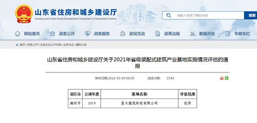近日,山東省住建廳發布了《山東省住房和城鄉建設廳關于2021年省級裝配式建筑產業基地實施情況評估的通報》。山東省共有121家產業基地通過評估,其中,省級現場評估的44家產業基地中,昌大建筑科技有限公司等12家產業基地評估結果為“優秀”。