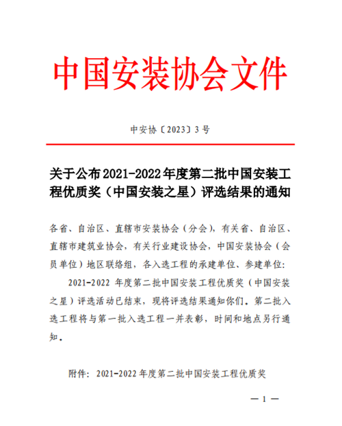 集團公司再創一個國家級安裝工程質量最高獎——安裝之星