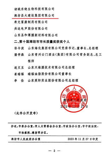 2023年11月27日,濰坊市人民政府公布了第十屆濰坊市市長質量獎獲獎名單,根據《濰坊市市長質量獎管理辦法》(濰政發〔2016〕14號),經自愿申報、資格審查、受理公示、材料評審、現場評審、陳述答辯、擬獎公示等程序,集團公司榮獲第十屆濰坊市市長質量獎。