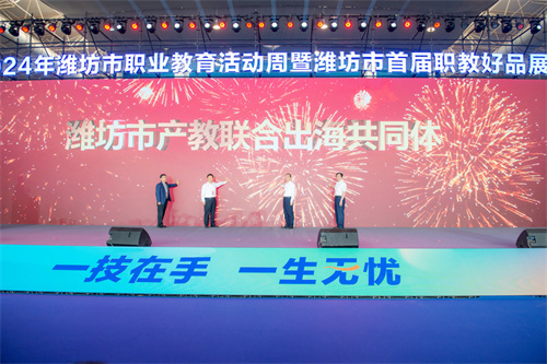 2024年5月17日上午,濰坊市產教聯合出海共同體成立揭牌儀式在富華國際展覽中心舉行,濰坊市副市長、市工商聯主席陳端梅出席。集團公司董事長徐鵬強出席儀式并與濰坊市教育局黨組書記、局長杜全平,山東科技職業學院黨委書記鄭德前,山東畜牧獸醫職業學院黨委書記鄭立森為共同體成立揭牌。