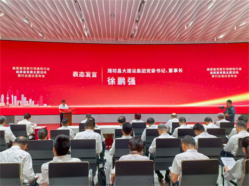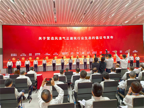 會議播放了建筑行業發展成果視頻《基石之力筑夢中國式現代化》;中國建筑董事長、黨組書記鄭學選進行了主旨發言;倡議發起單位代表中鐵二局黨委副書記、總經理張兵,中核集團副總工程師、中國核建黨委書記、董事長陳寶珠,上海建工集團黨委副書記、工會主席殷紅霞,濰坊昌大建設集團董事長徐鵬強分別進行了表態發言;中建一局黨委書記、董事長左強代表建筑企業宣讀了倡議書,中建二局、中國核建、中機建設、中國中冶、通用技術集團新興公司、中國化學國際公司、中鐵電氣化局、中鐵建設、中交一公局集團、中國電建水電七局、中國能建浙江火電、中國安能一局、北京城建、隧道股份、廣東建工控股、山東科達集團、濰坊昌大建設集團、興泰建設集團領導,共同按壓大屏手印圖案,聯合發布了《關于號召建筑行業黨組織和廣大黨員在營造風清氣正行業環境中走在前作表率的倡議書》。