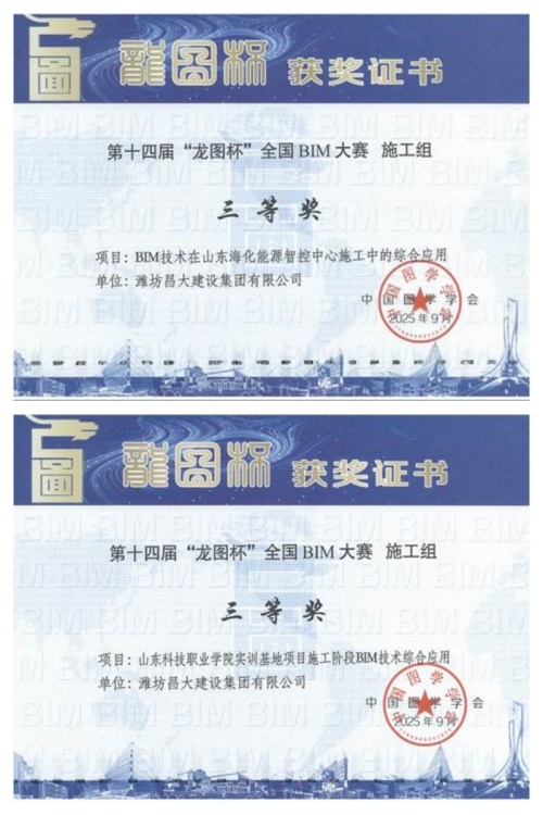 二則是,由中國圖學(xué)學(xué)會舉辦的第十四屆“龍圖杯”全國BIM大賽公布了獲獎結(jié)果。集團公司申報的《BIM技術(shù)在山東海化能源智控中心施工中的綜合應(yīng)用》、《山東科技職業(yè)學(xué)院實訓(xùn)基地項目施工階段BIM技術(shù)綜合應(yīng)用》均獲三等獎。實現(xiàn)歷史新突破。